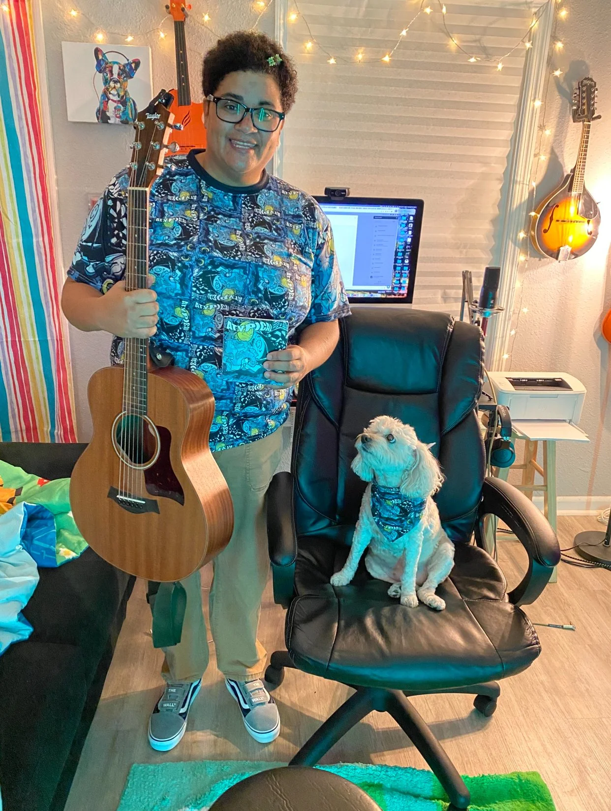 Person holding an acoustic guitar in a music-themed room, standing next to a small dog sitting on an office chair. The room has musical instruments and colorful decorations.